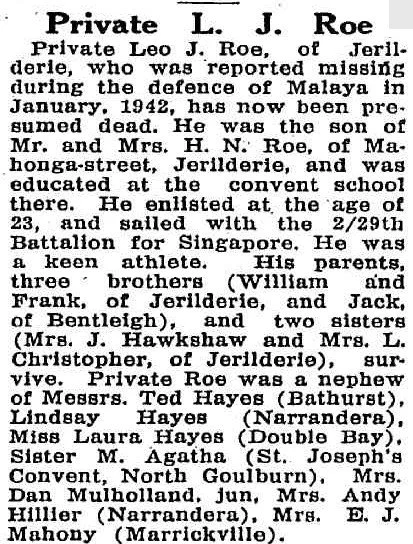 ROE Leo James VX57182 C Coy [Muar] R 14 June Written By 2/29 Battalion Catholic Weekly (Sydney, NSW : 1942 - 1954), Thursday 30 May 1946, page 16 C CoyMuar 2/29 Battalion